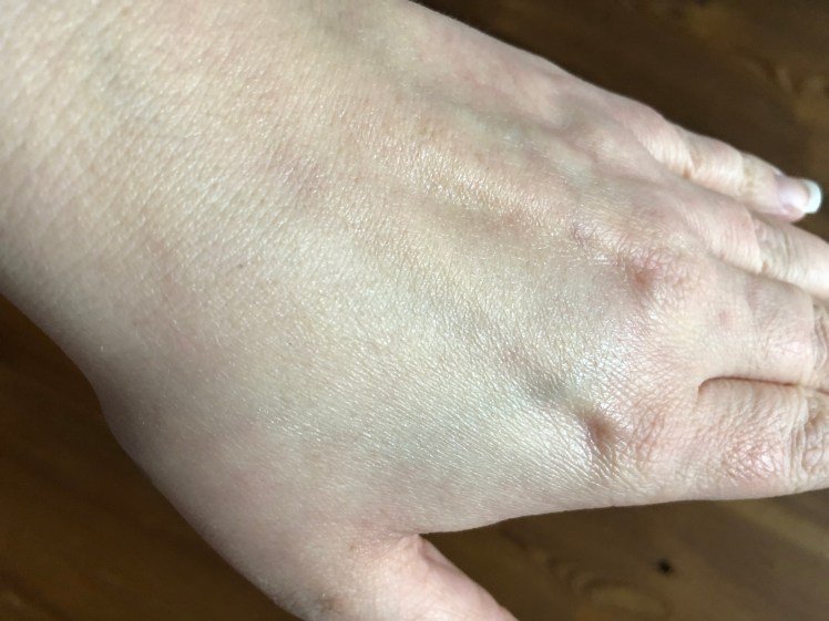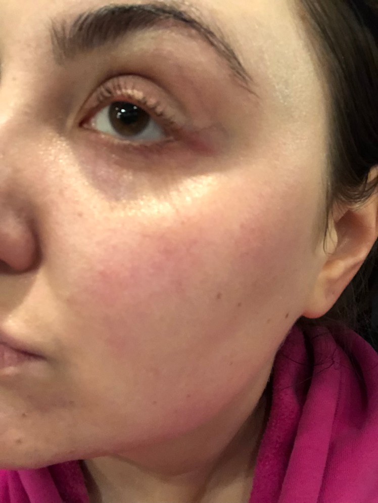Ich trage darunter nur ein Hydrolat und ein Serum auf, kein Gesichtsöl. Für meine Haut ist die Kombination mit einem Gesichtsöl zu viel.